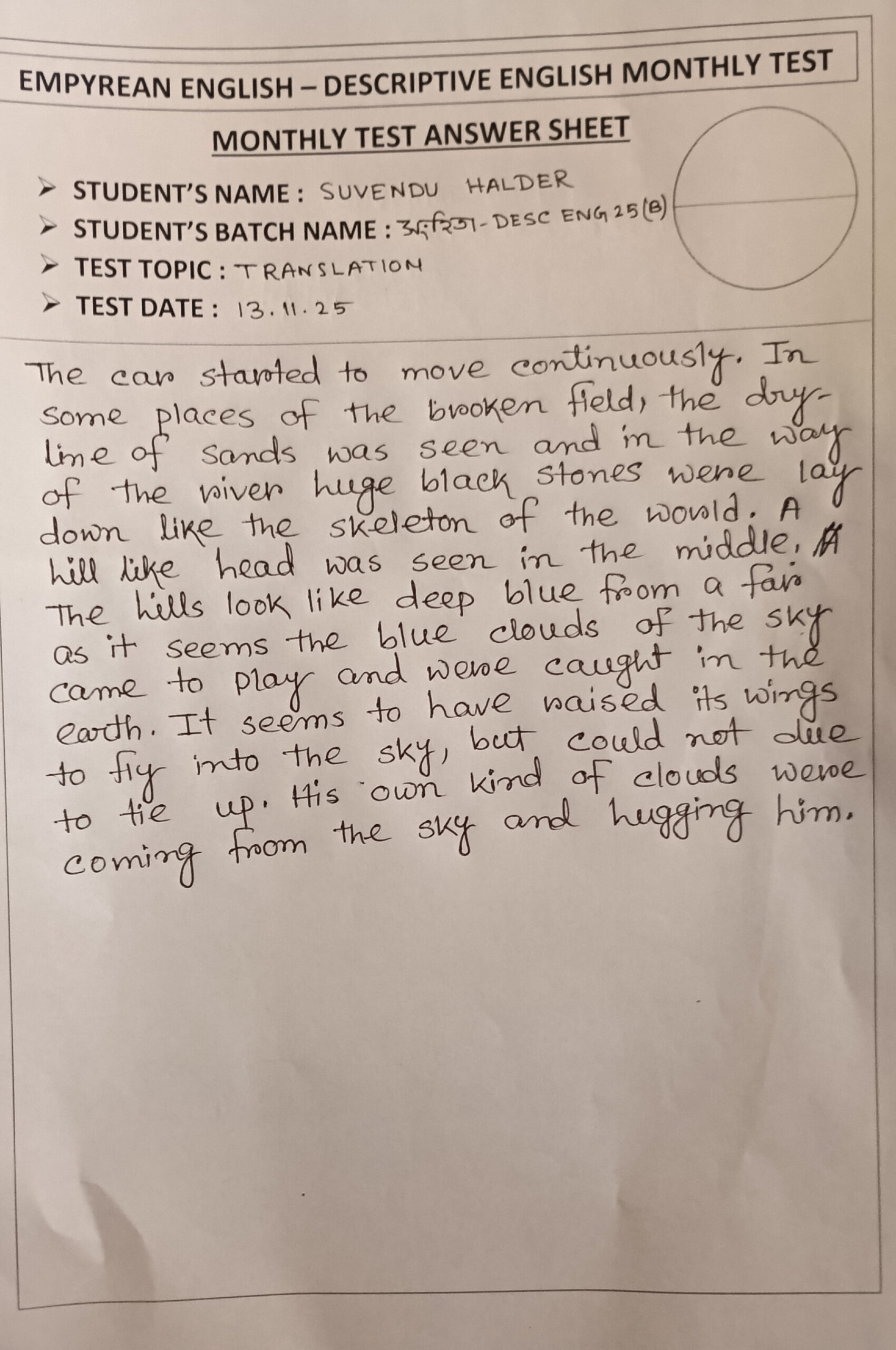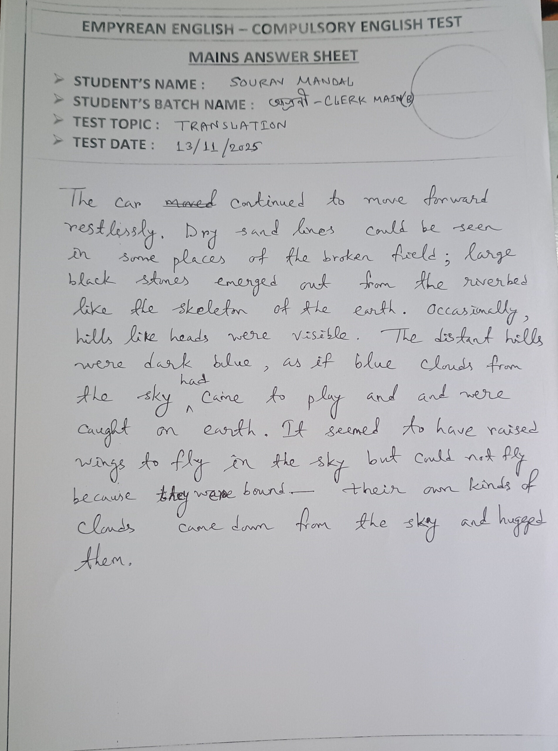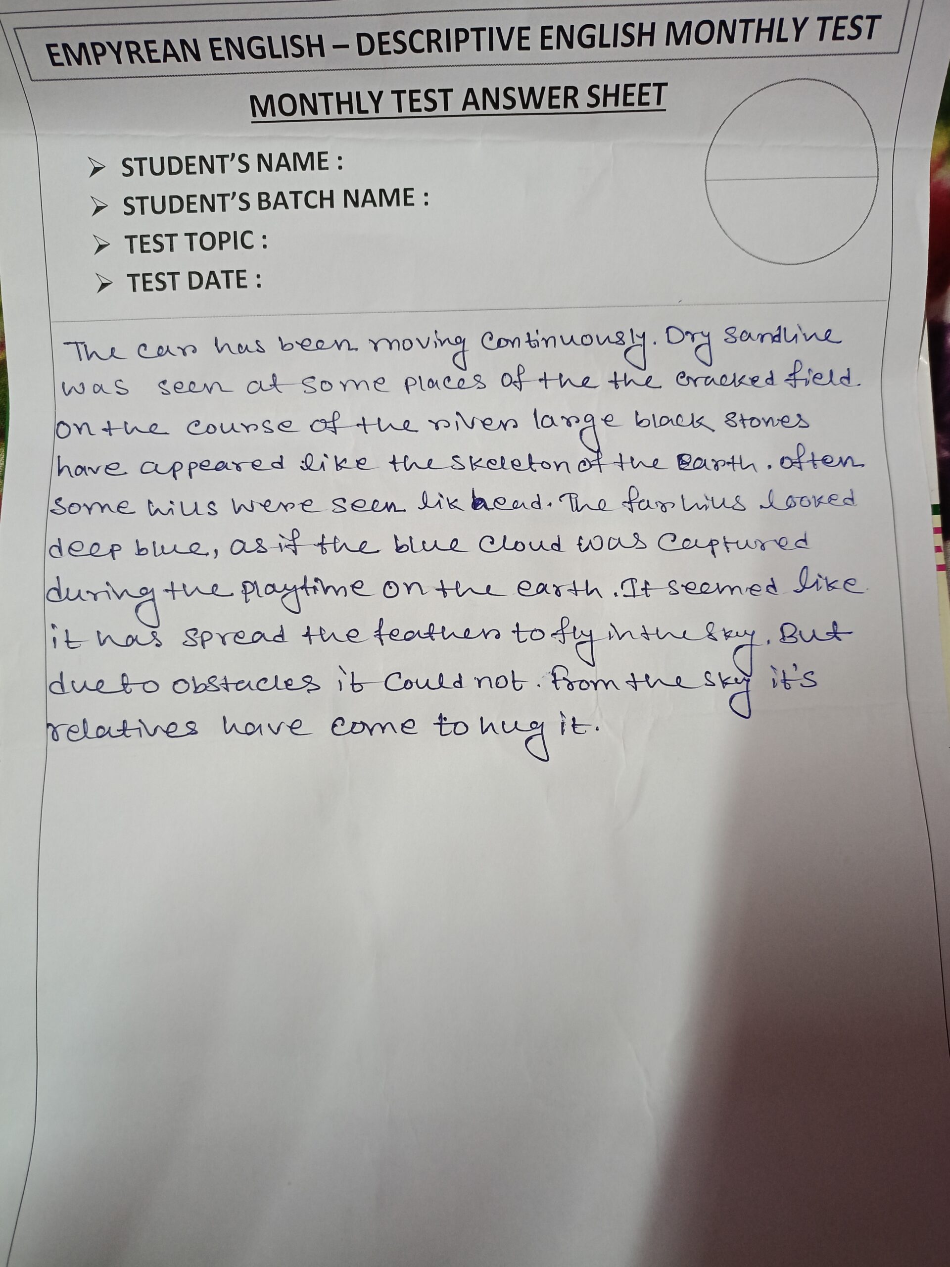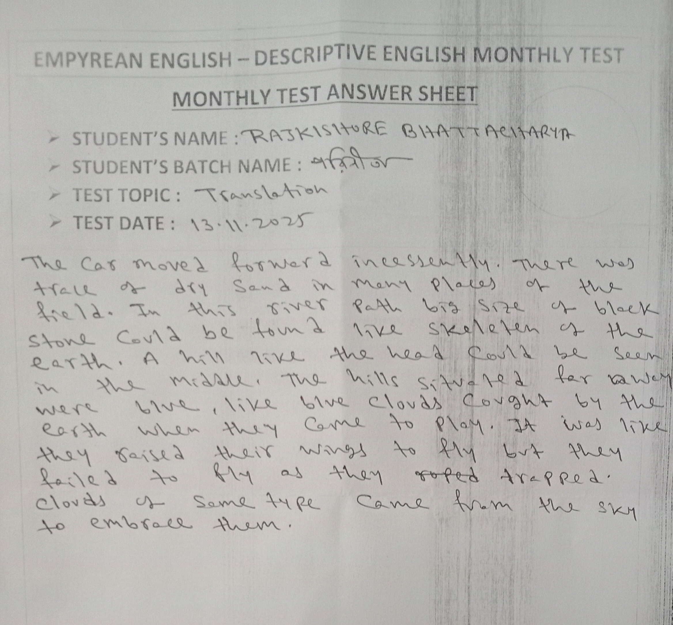 The car started moving forward fast and steadily./The car began to move forward fast and steadily. Dried sand-bed was seen/visible in some places of the uneven field. Many enormous sizes of black stones/Many giant black stones, looked like the skeleton of the earth came out /made their heads a little higher on the way to the river. In some places, a few hills, looked like the skeleton of human head, were visible. The far-off hills appeared deep blue as if the blue clouds of the sky came down to play with them and got caught. It seemed that the clouds spread their wings to fly in the sky but could not as they were tied up and their fellow friends from the sky were coming down and going upward after embracing them.