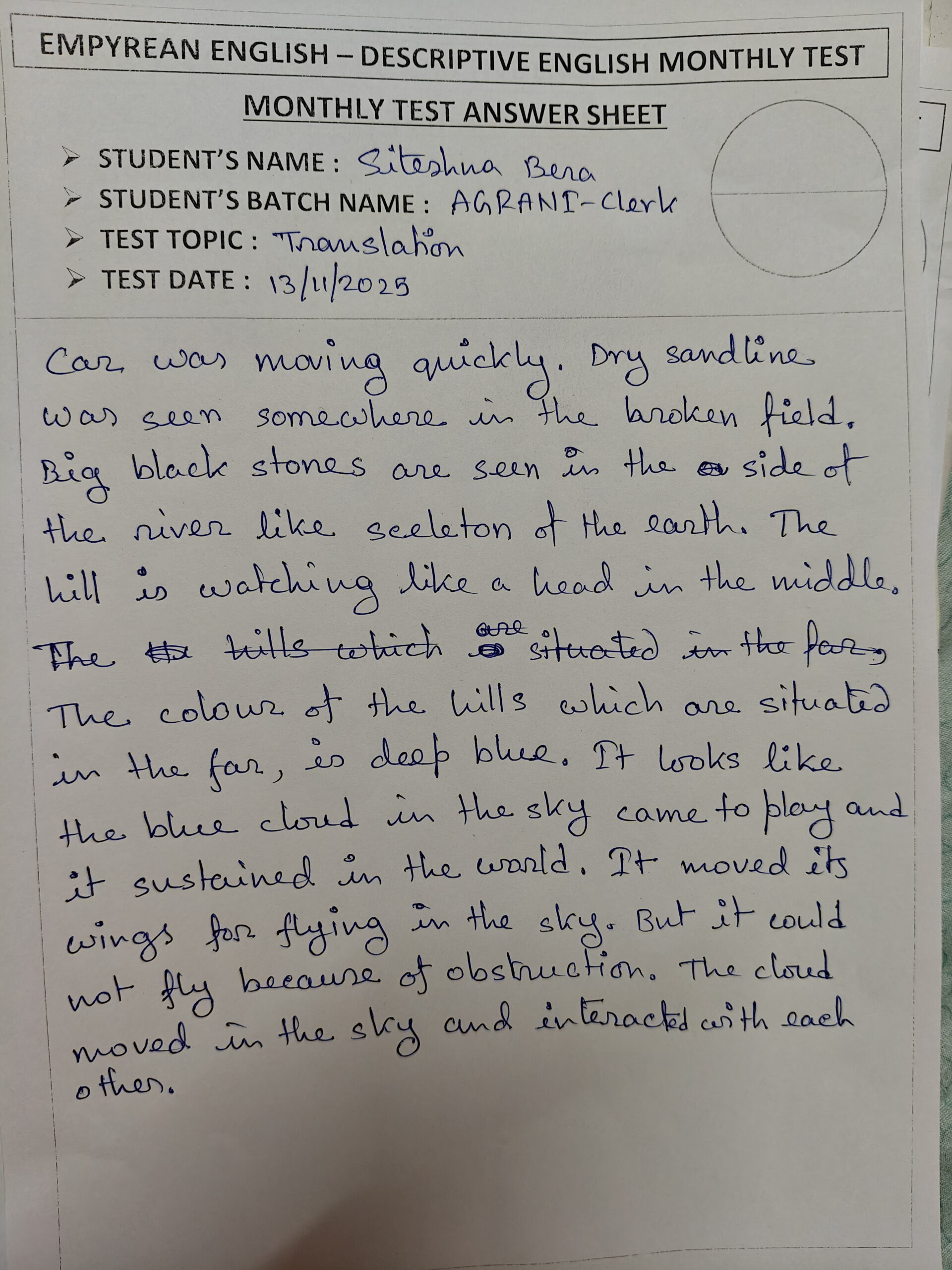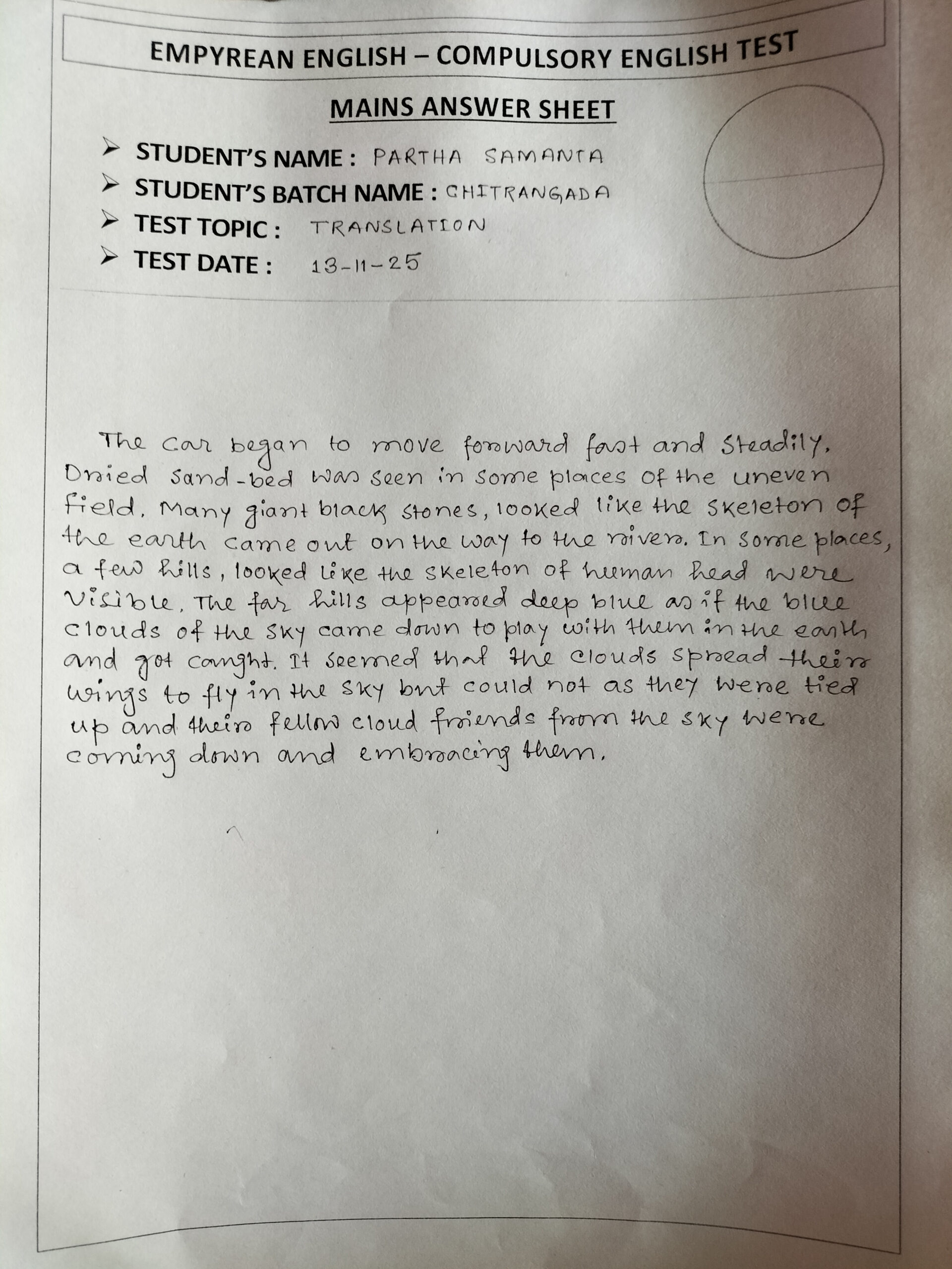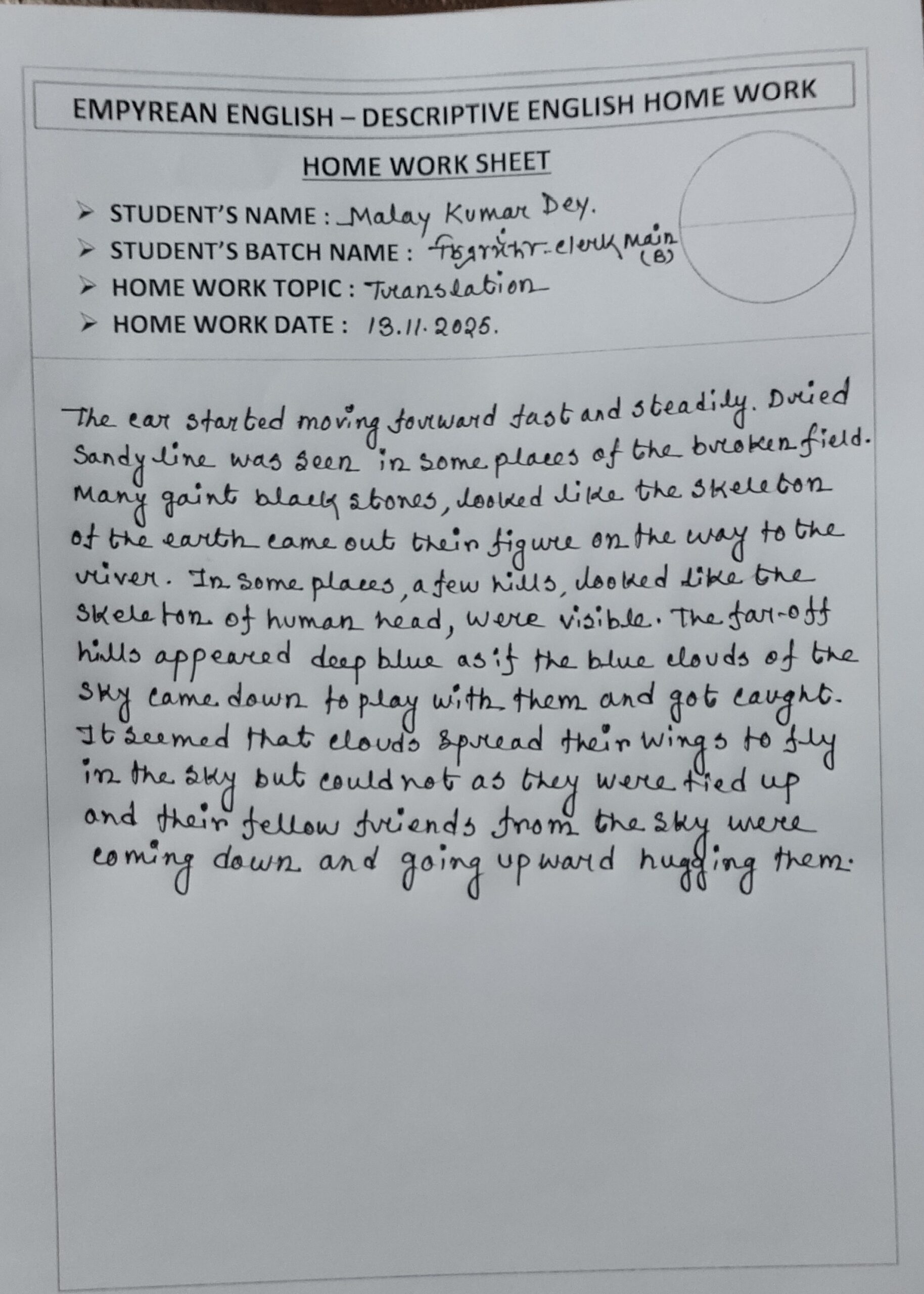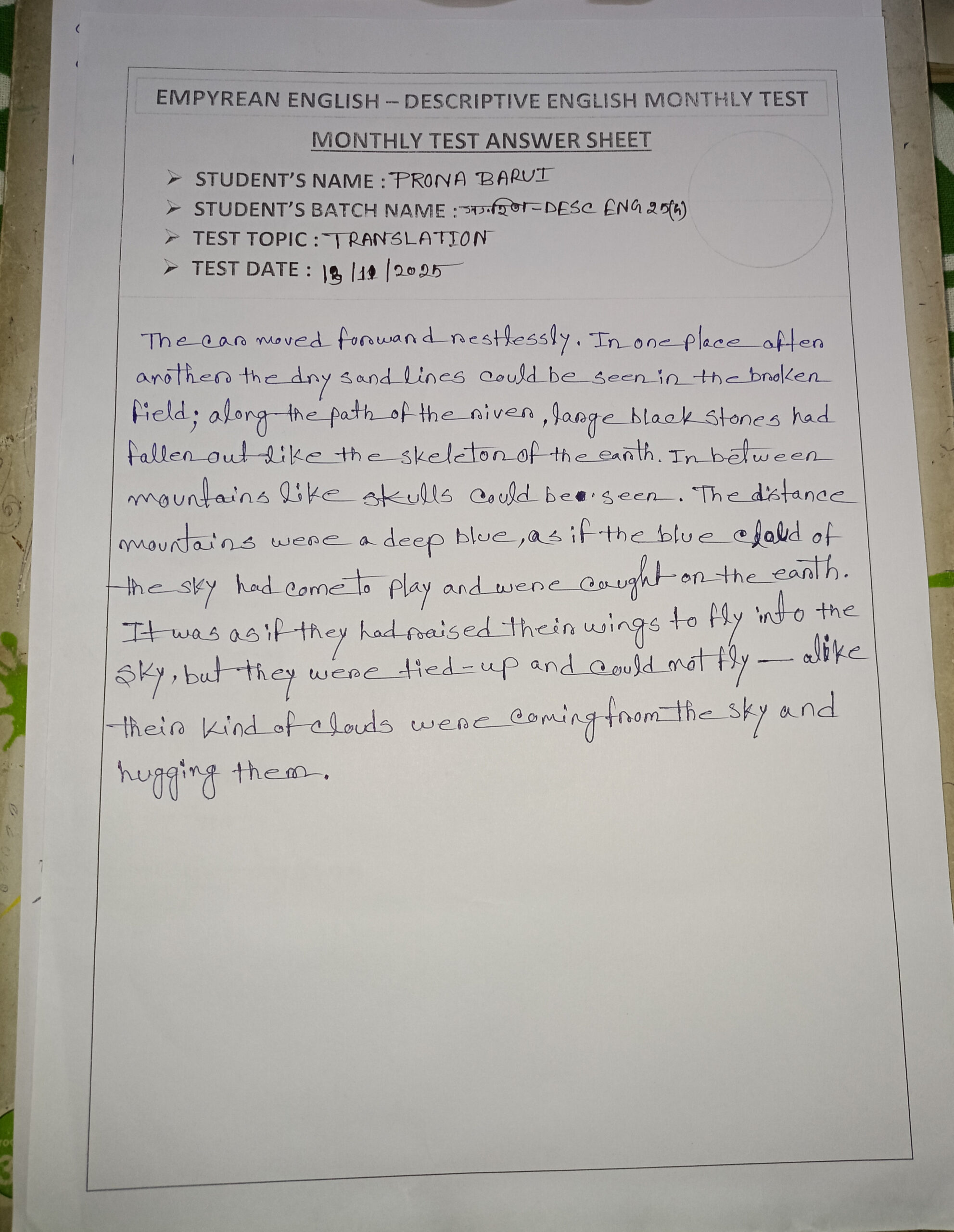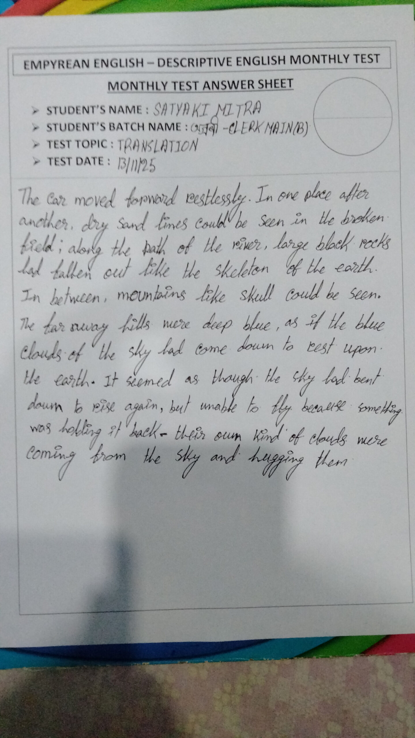 The car started moving forward fast and steadily./The car began to move forward fast and steadily. Dried sand-bed was seen/visible in some places of the uneven field. Many enormous sizes of black stones/Many giant black stones, looked like the skeleton of the earth came out /made their heads a little higher on the way to the river. In some places, a few hills, looked like the skeleton of human head, were visible. The far-off hills appeared deep blue as if the blue clouds of the sky came down to play with them and got caught. It seemed that the clouds spread their wings to fly in the sky but could not as they were tied up and their fellow friends from the sky were coming down and going upward after embracing them.