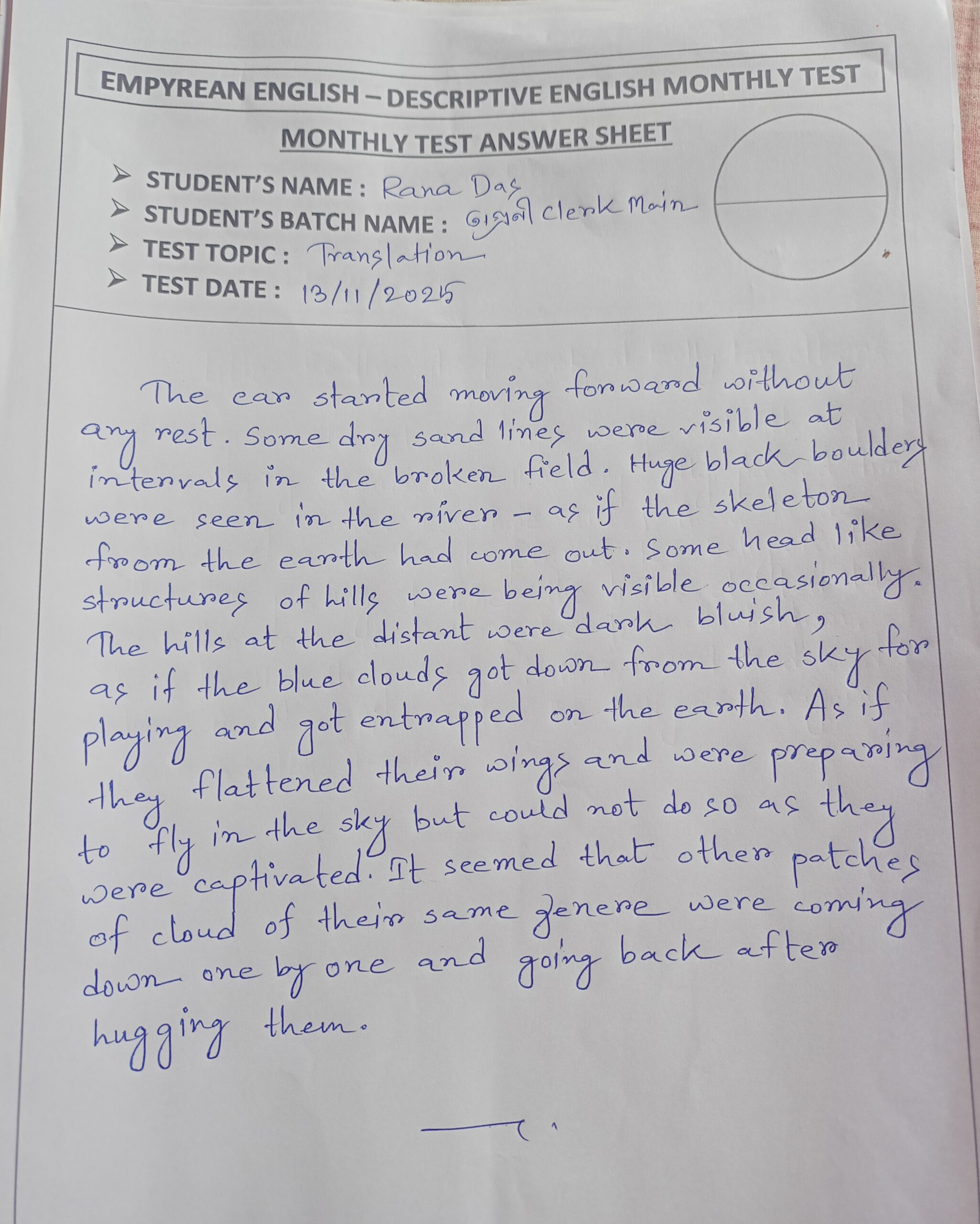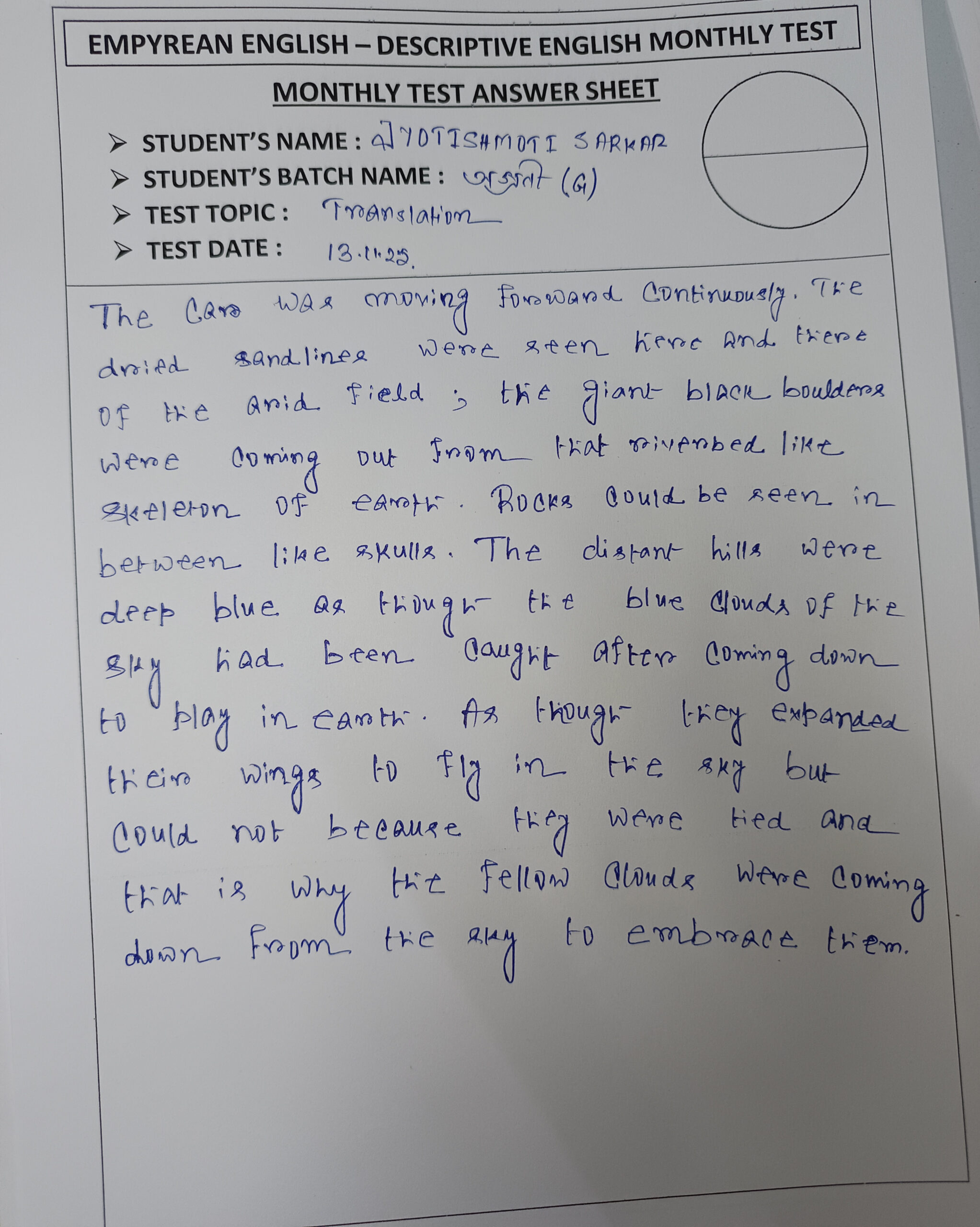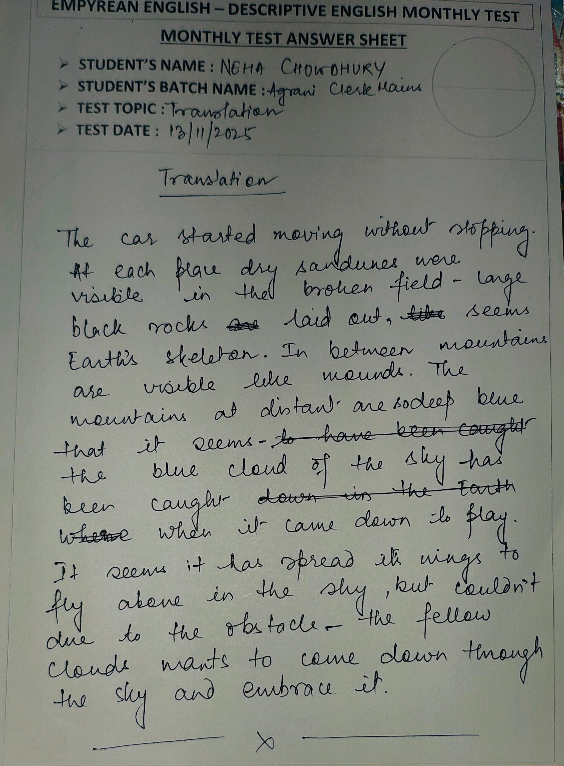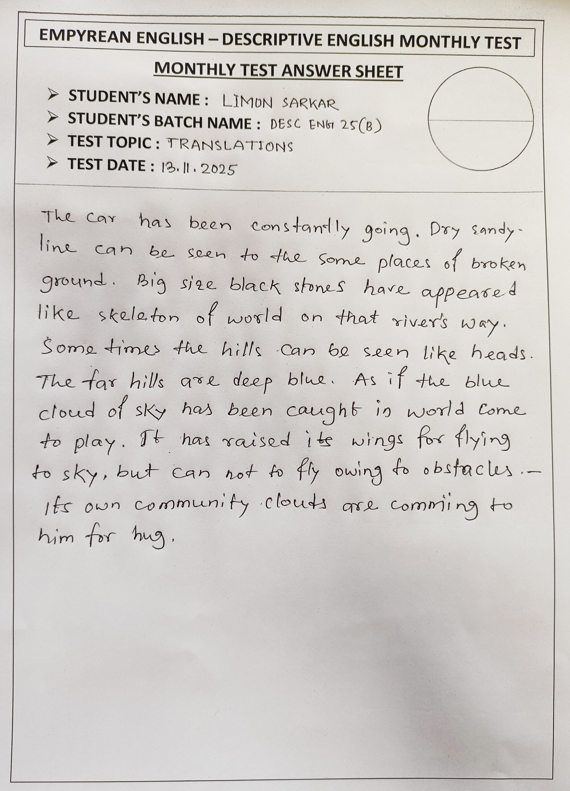 The car started moving forward fast and steadily./The car began to move forward fast and steadily. Dried sand-bed was seen/visible in some places of the uneven field. Many enormous sizes of black stones/Many giant black stones, looked like the skeleton of the earth came out /made their heads a little higher on the way to the river. In some places, a few hills, looked like the skeleton of human head, were visible. The far-off hills appeared deep blue as if the blue clouds of the sky came down to play with them and got caught. It seemed that the clouds spread their wings to fly in the sky but could not as they were tied up and their fellow friends from the sky were coming down and going upward after embracing them.