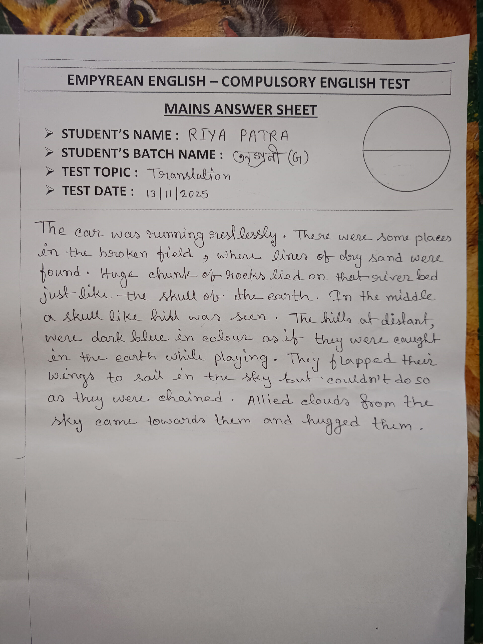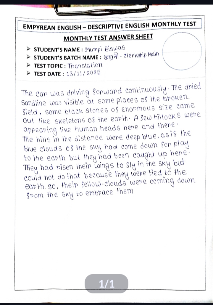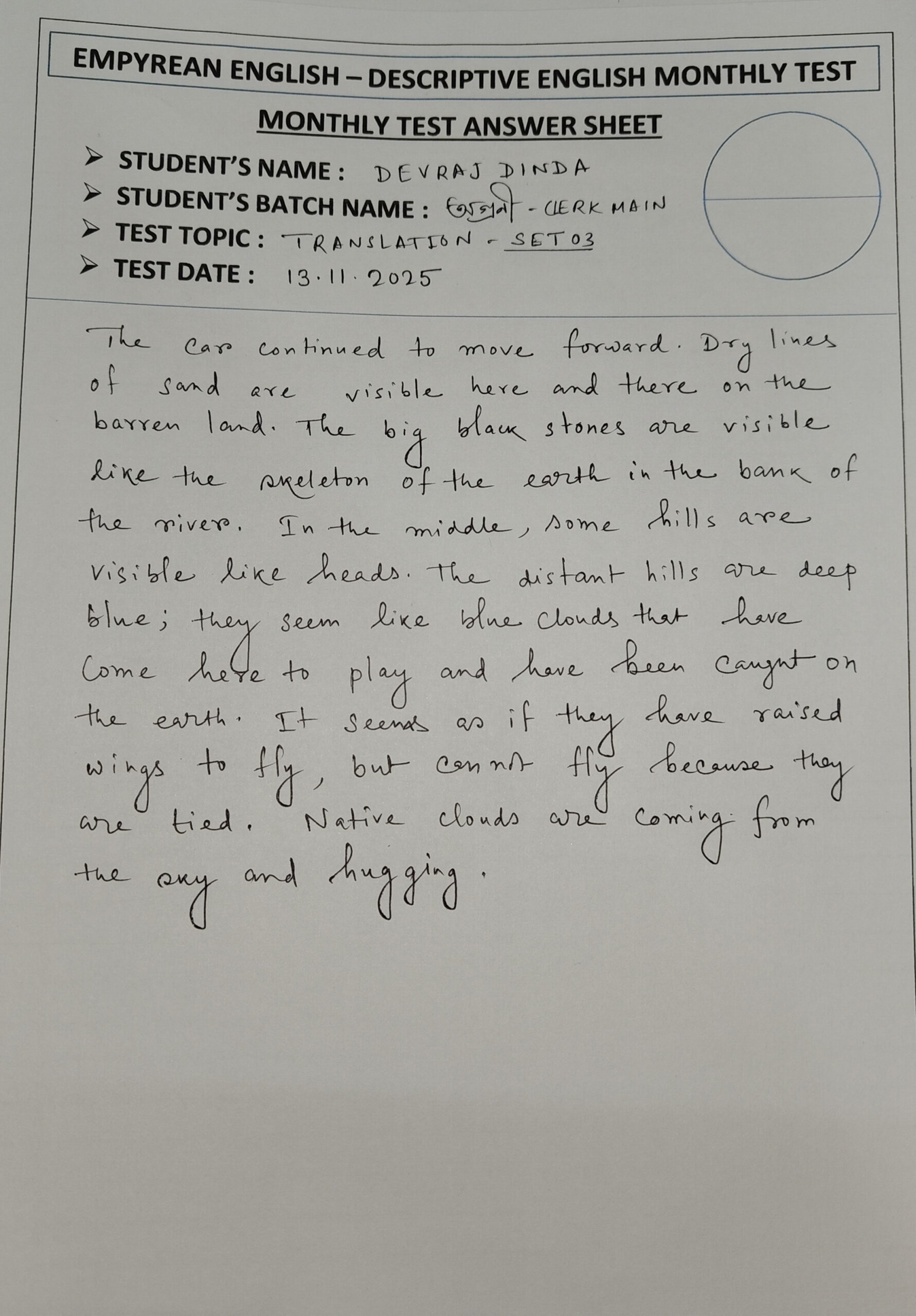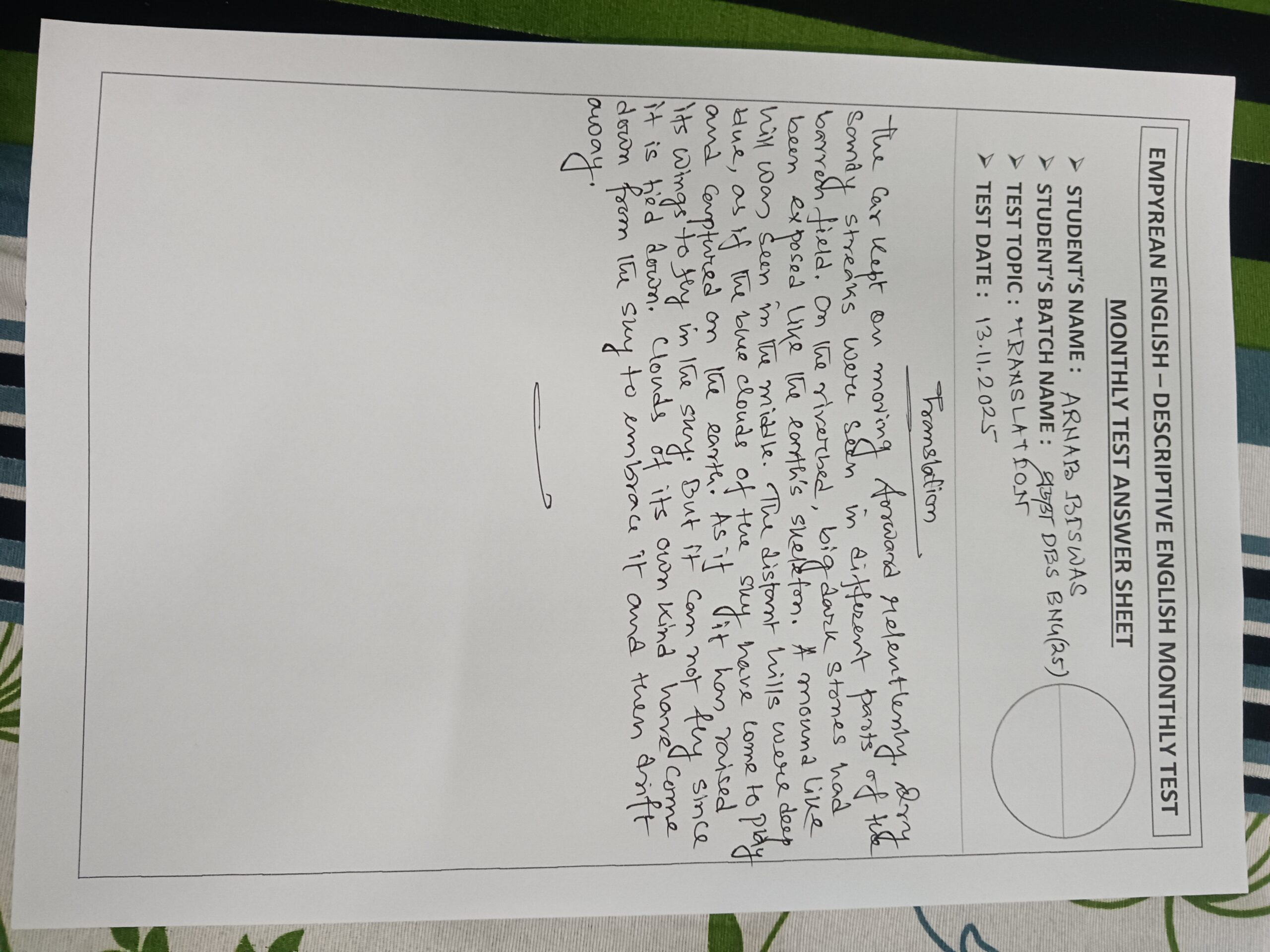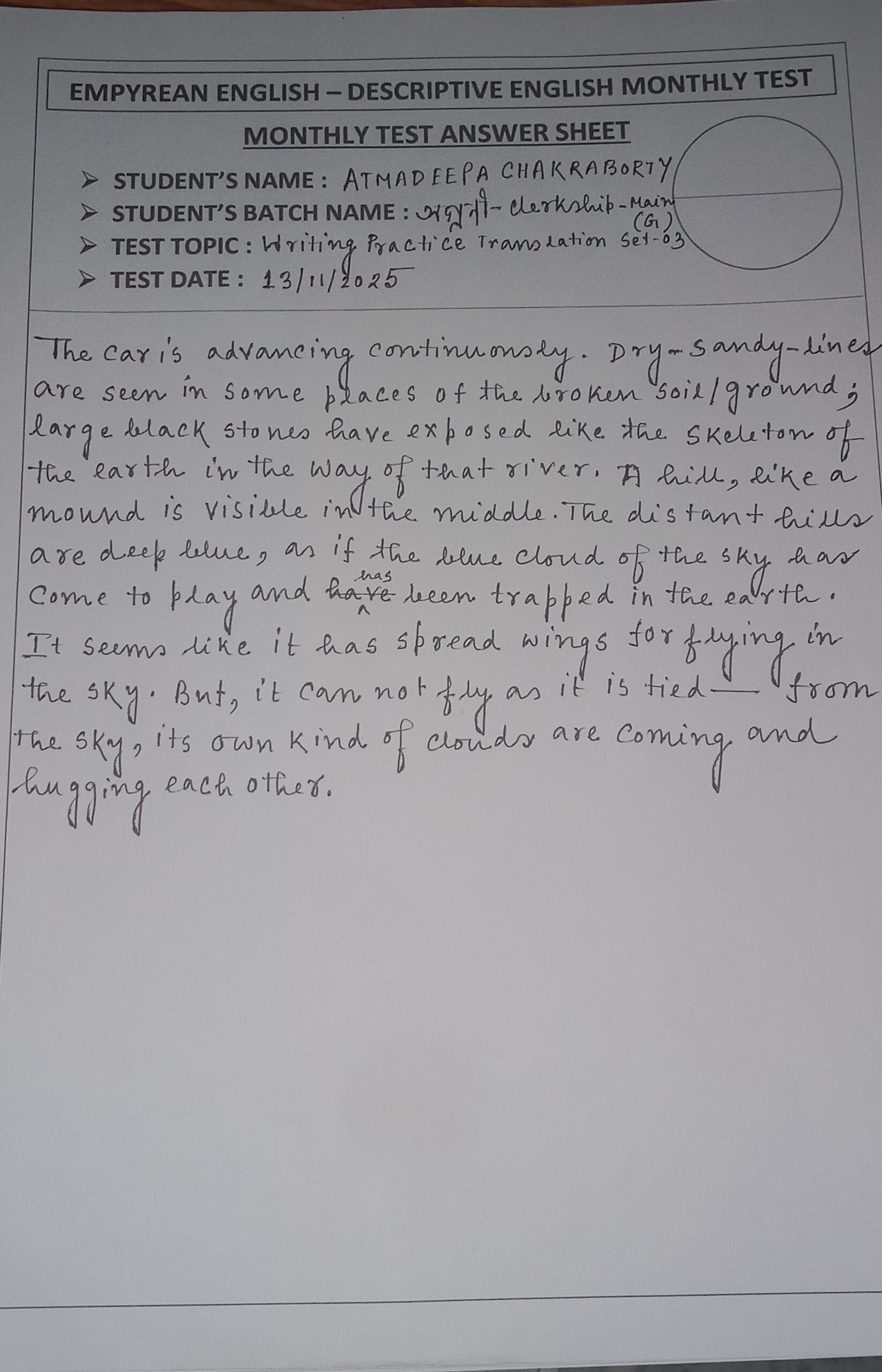 The car started moving forward fast and steadily./The car began to move forward fast and steadily. Dried sand-bed was seen/visible in some places of the uneven field. Many enormous sizes of black stones/Many giant black stones, looked like the skeleton of the earth came out /made their heads a little higher on the way to the river. In some places, a few hills, looked like the skeleton of human head, were visible. The far-off hills appeared deep blue as if the blue clouds of the sky came down to play with them and got caught. It seemed that the clouds spread their wings to fly in the sky but could not as they were tied up and their fellow friends from the sky were coming down and going upward after embracing them.